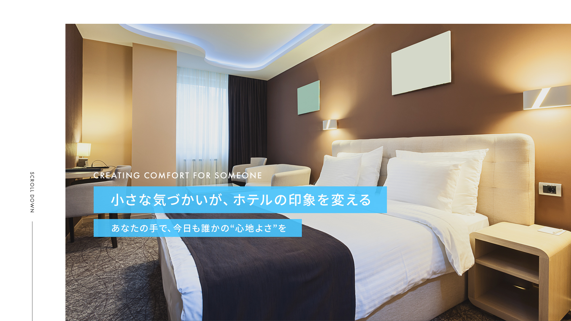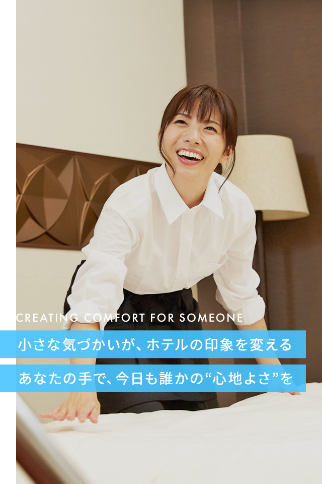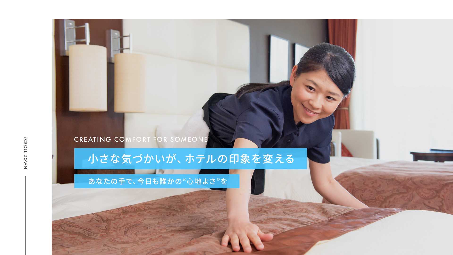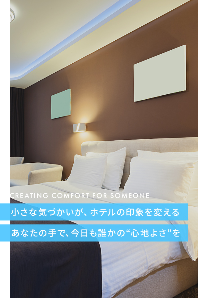 ベッドメイキングからバスルームやトイレの清掃、アメニティの補充、掃除機がけ、ゴミ回収、備品の点検など客室内の全体を清掃、整頓していく仕事になります。