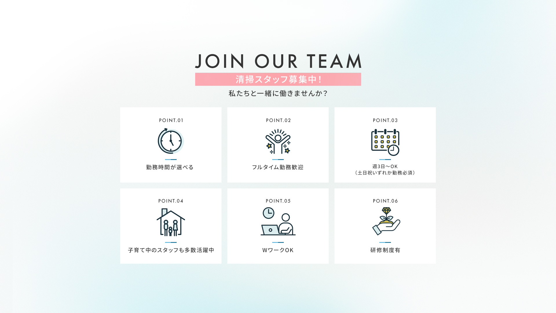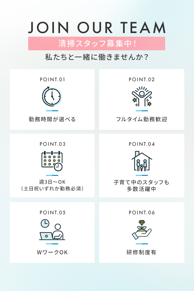 初めての方も安心してスタートできるよう、丁寧な研修制度を用意しています。基本的な清掃の流れからマナーまで、先輩スタッフが優しくサポート。未経験からでも安心して成長できる環境です。